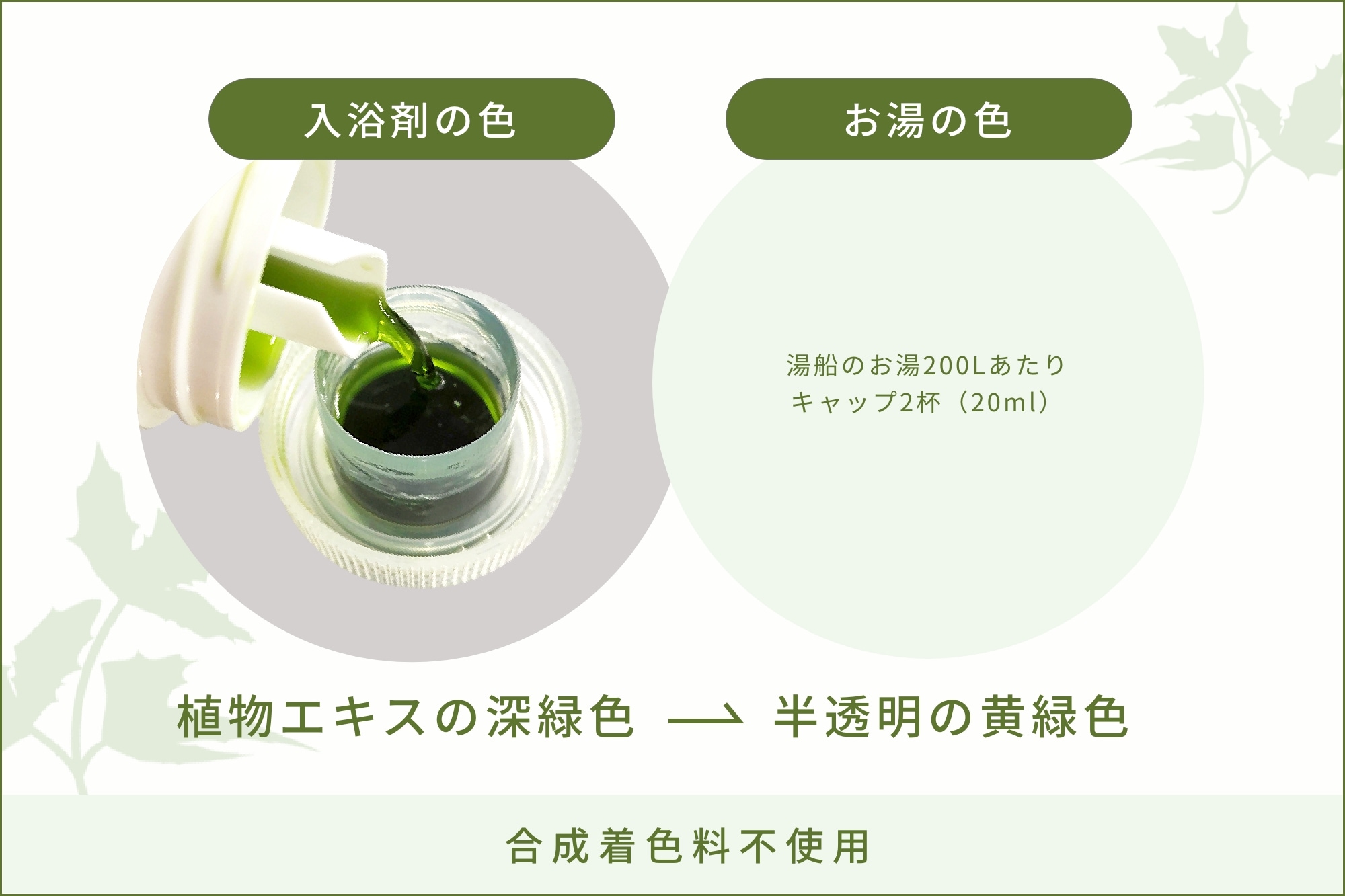 浴槽のお湯 約200L あたり、キャップ2杯分(約20ml)を入れ、よくお湯をかき混ぜてから入浴してください。